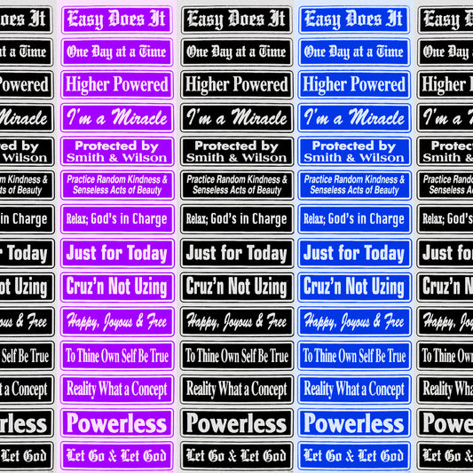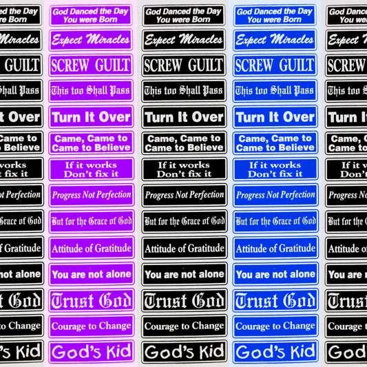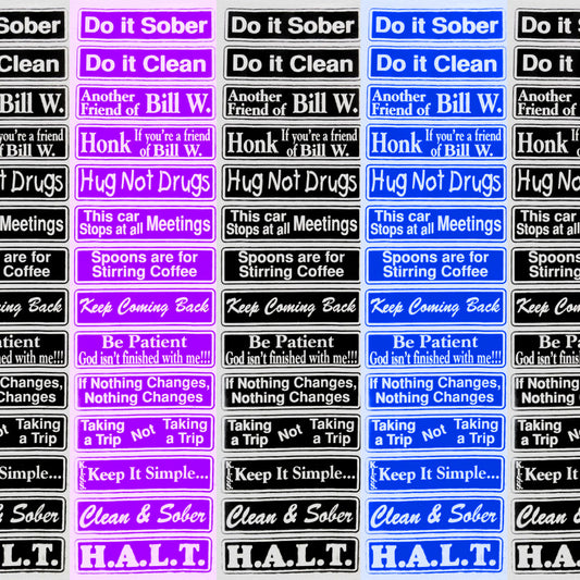 Our Recovery Sayings Collection brings together a variety of stickers and license plate frames that celebrate the journey of sobriety, positivity, and resilience. With a range of sayings that inspire humor, faith, and self-compassion, this collection includes everything from mini sticker strips with multiple sayings to durable license plate frames designed for cars, trucks, or trailers. Each item in the collection serves as a meaningful reminder of recovery principles, offering motivation and support to those who embrace each day one step at a time. Perfect for individuals in the Twelve Step community and anyone dedicated to living a positive, substance-free life, this collection provides both personal inspiration and a way to share encouragement with others.